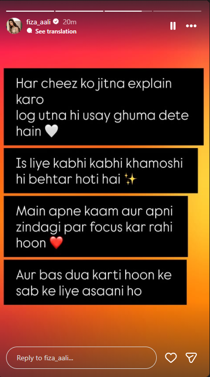 فضا علی نے مزید کہا کہ وہ ہمیشہ اپنے کام اور ناظرین کا احترام کرتی آئی ہیں اور آئندہ بھی اپنی پیشہ ورانہ ذمہ داریاں اسی سنجیدگی اور خلوص کے ساتھ نبھاتی رہیں گی۔