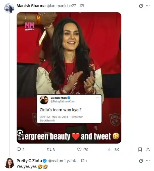 16 اپریل کو ممبئی انڈینز کے خلاف پنجاب کنگز کی جیت کے بعد پریتی زنٹا نے بھی ٹیم کی کارکردگی کو سراہتے ہوئے ایک پرجوش پوسٹ شیئر کی، جس میں انہوں نے کھلاڑیوں، کپتان اور کوچنگ اسٹاف کی بھرپور تعریف کی۔ اسی دوران ایک مداح کی جانب سے سلمان خان کے 2014 والے ٹویٹ کا حوالہ دیے جانے پر پریتی زنٹا نے مختصر مگر دلچسپ انداز میں “Yes Yes Yes” لکھتے ہوئے ہنستے ہوئے ایموجی کا استعمال کیا۔