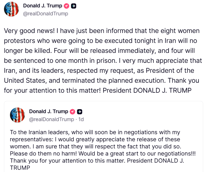 امریکی صدر ڈونلڈ ٹرمپ نے دعویٰ کیا ہے کہ ایران میں سزائے موت کا سامنا کرنے والی 8 خواتین کو اب پھانسی نہیں دی جائےگی۔