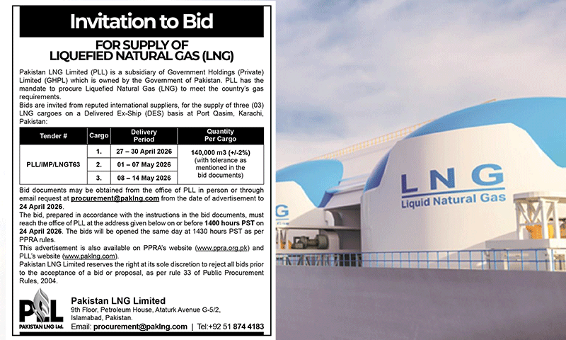 پاکستان میں توانائی کی ضروریات پوری کرنے کے لیے پاکستان ایل این جی لمیٹڈ نے بین الاقوامی سپلائرز سے اپریل اور مئی کے لیے ایل این جی کارگو کی خریداری کا ٹینڈر جاری کر دیا ہے۔