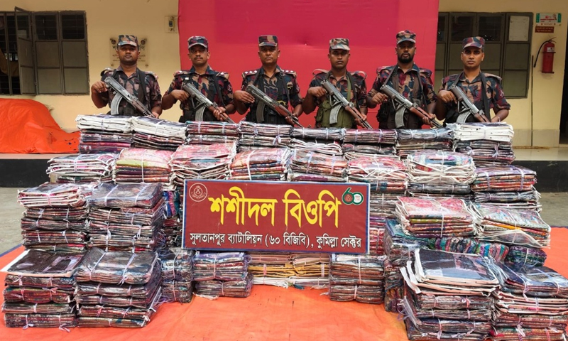 بنگلہ دیش بارڈر گارڈ (بی جی بی) نے کومیلا سرحد کے قریب اسمگلنگ کے خلاف ایک بڑی کارروائی کرتے ہوئے 84 لاکھ 50 ہزار ٹکا سے زائد مالیت کی بھارتی ساڑیاں قبضے میں لے لی ہیں۔ حکام کے مطابق یہ کارروائی خفیہ اطلاع ملنے پر برہمن پاڑہ اپ ضلع کے سرحدی علاقے میں کی گئی۔