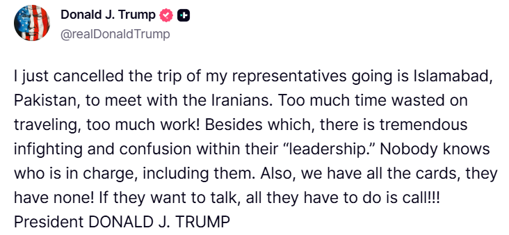 دریں اثنا سوشل میڈیا پر جاری ایک بیان میں بھی صدر ٹرمپ نے اسٹیو وٹکوف اور جیرڈ کشنر کے دورے کی منسوخی کا اعلان کیا۔