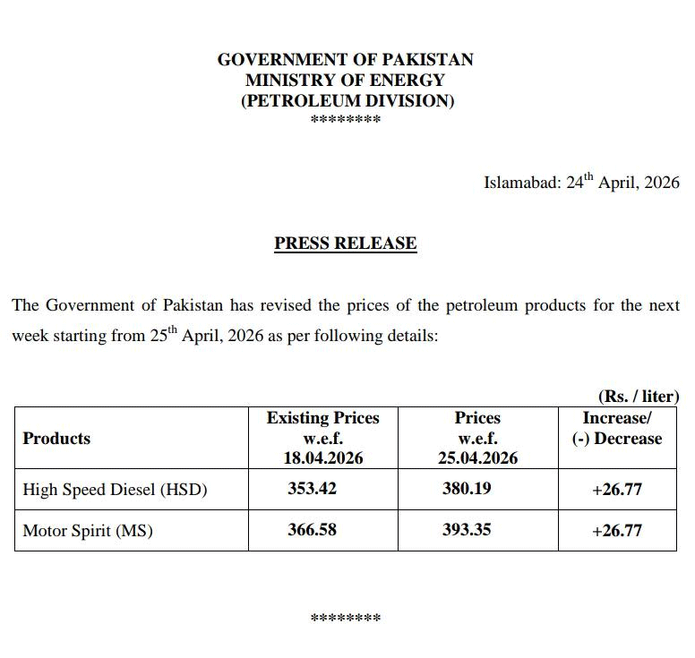 وفاقی حکومت نے پیٹرولیم مصنوعات کی قیمتوں میں ایک بار پھر بھاری اضافے کا اعلان کردیا ہے۔ وزارتِ توانائی کی جانب سے جاری کردہ نوٹیفکیشن کے مطابق نئی قیمتوں کا اطلاق 25 اپریل 2026 سے ہوگا۔