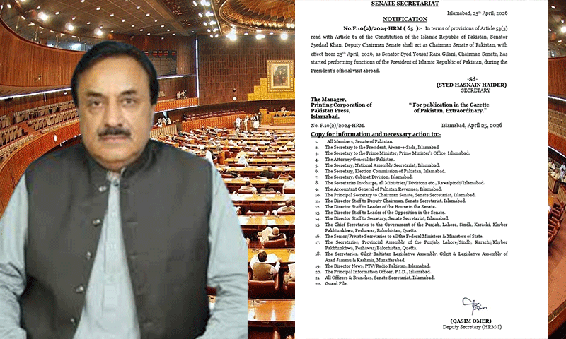 جاری کردہ نوٹیفکیشن کے مطابق یہ تقرری آئینِ پاکستان کے آرٹیکل 53(3) اور آرٹیکل 61 کے تحت عمل میں لائی گئی ہے۔ سینیٹر سیدال خان، جو ڈپٹی چیئرمین سینیٹ ہیں، 25 اپریل 2026 سے بطور قائم مقام چیئرمین سینیٹ ذمہ داریاں انجام دیں گے۔