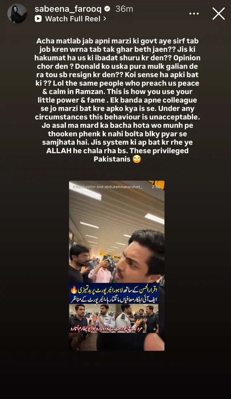 لاہور ایئرپورٹ کے امیگریشن کاؤنٹر پر ایف آئی اے اہلکار اور سابق ٹی وی میزبان و سیاستدان اقرار الحسن کے درمیان پیش آنے والے تلخ واقعے کی ویڈیو وائرل ہونے کے بعد اداکارہ سبینہ فاروق نے شدید ردعمل دیا ہے۔