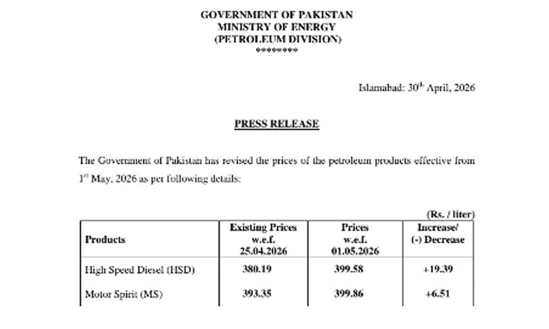 قیمتوں میں اضافے کے بعد پیٹرول کی نئی قیمت 399روپے 86پیسے مقرر کی گئی ہے، ہائی اسپیڈ ڈیزل کی نئی قیمت 399روپے 58پیسے ہوگئی ہے۔
