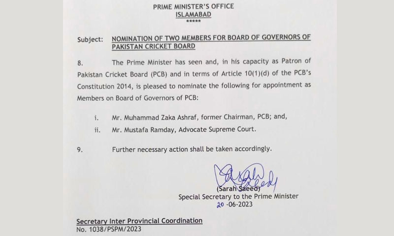 وزیر اعظم شہباز شریف نے سابق چیئرمین پی سی بی ذکاءاشرف اور سپریم کورٹ کے وکیل مصطفٰی رمدے کو پاکستان کرکٹ بورڈ کے بورڈ آف گورنرز کا رکن نامز د کر دیا ہے۔