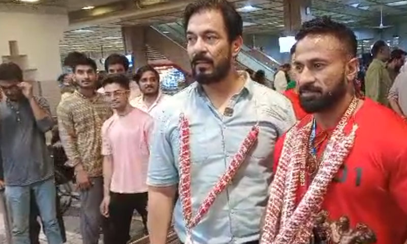 کراچی ایئرپورٹ پر فیملی، دوستوں اور باڈی بلڈرز کمیونٹی نے پھولوں کے ہار پہنا کر ان کا استقبال کیا۔