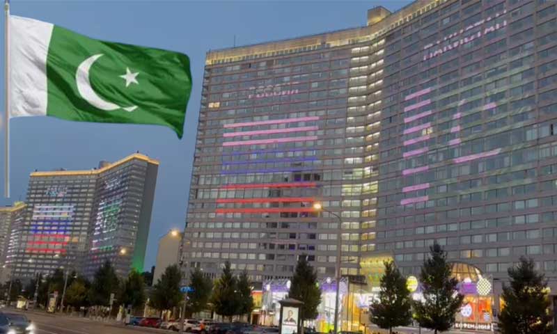 روس کے دارالحکومت ماسکو کے دل میں واقع مشہور ارباط پر موجود 3 کثیرالمنزلہ عمارتوں پر پاکستانی اور روسی پرچم پہلی بار ڈیجیٹل طریقے سے آویزاں کر دیے گئے۔