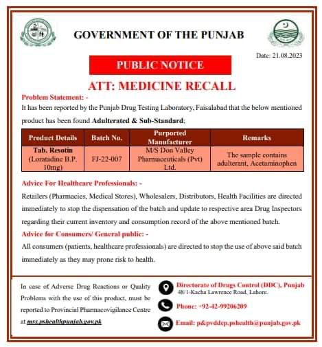 ’ٹیبلٹ ریسوٹن کی دوا فوری طور پر واپس بھجوائی جائے۔‘