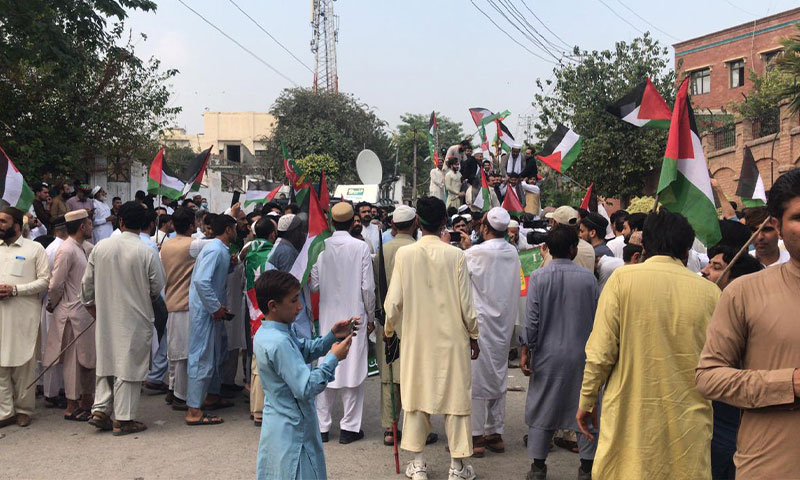 لاہور میں جماعت اسلامی پاکستان کی جانب سے مال روڈ پر ایک بڑی ریلی نکالی گئی جس میں خواتین اور بچوں کی بڑی تعداد نے شرکت کی۔ مظاہرین نے فلسطین کا بڑا پرچم اٹھا رکھا تھا۔