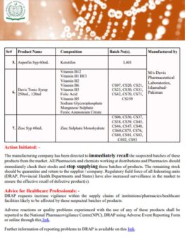 ڈریپ نے اسی طرح ڈیوس فارما کو نزلہ اور زکام کے سیرپ اور کھانسی کے سیرپ سمیت اعصابی امراض کے سیرپ کا ایک ایک بیچ مارکیٹ سے واپس اٹھانے کی ہدایت کی ہے۔