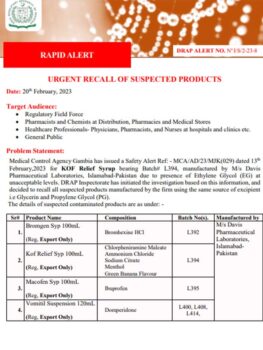 پاکستانی فارما سیوٹیکل کمپنی کے تیارکردہ کھانسی کے سیرپ پر مغربی افریقہ کے ملک گیمبیا میں سیفٹی الرٹ جاری ہونے بعد ڈرگ ریگولیٹری اتھارٹی آف پاکستان نے ڈیوس فارما کی مشتبہ مصنوعات کے حوالے سے انتباہی مراسلہ جاری کیا ہے۔