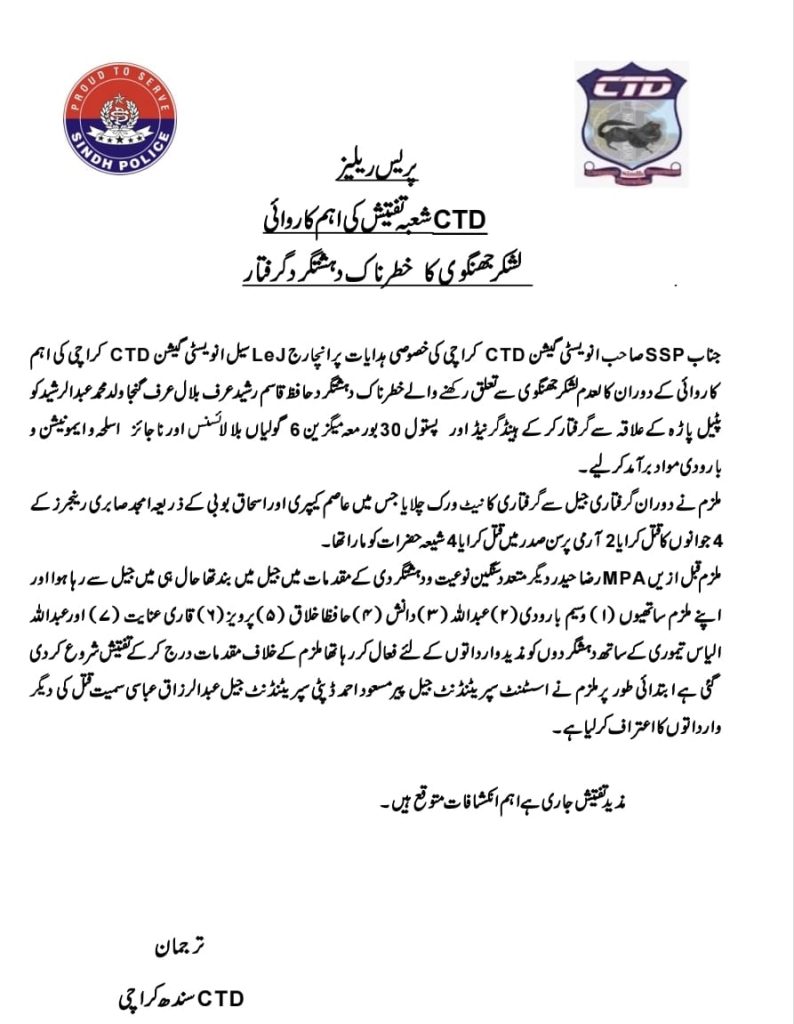 سندھ پولیس کے محکمہ انسداد دہشتگردی یعنی سی ٹی ڈی کے ترجمان نے ایک بیان میں اس کارروائی کی بابت بتایا ہےکہ دہشتگرد حافظ قاسم رشید عرف گنجا کو خفیہ اطلاع پر گرفتار کرکے اس کے قبضے سے ہینڈ گرینیڈ، پستول اور بارودی مواد برآمد کیا گیا ہے۔